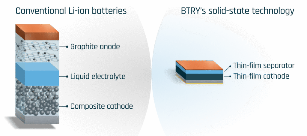 Comparison of conventional Li-ion and BTRY’s all-solid-state design: fewer layers, no liquid electrolyte, and an ultra-thin, safer architecture. Source: BTRY.